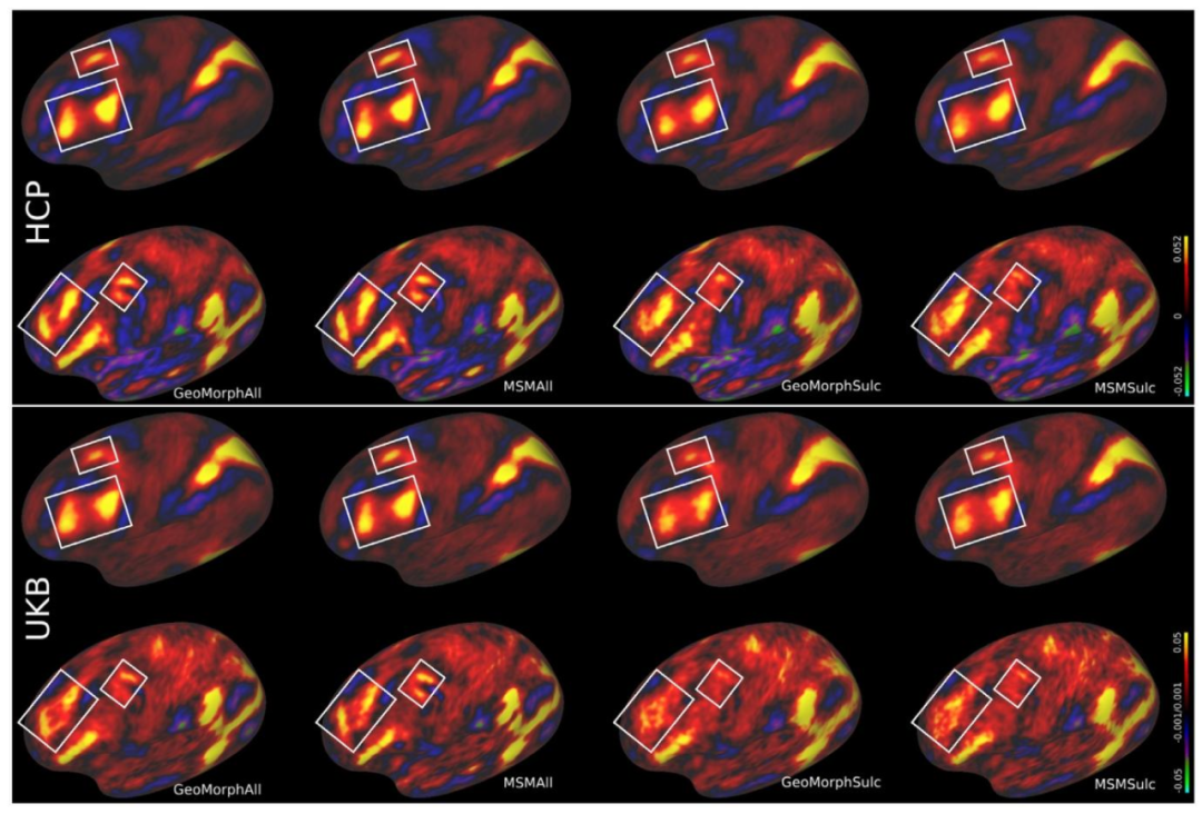 图8人类连接组计划(HCP,上方)和英国生物银行(UKB,下方)数据集中静息态功能磁共振成像(rfMRI)特征的受试者间平均值。白色框突出显示的区域为大脑中对比度存在显著差异且各方法性能提升明显的区域。