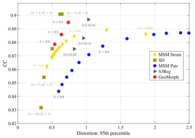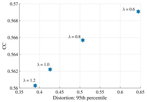 图10 不同正则化水平下,相似性表现与区域失真第95百分位数的关系图。