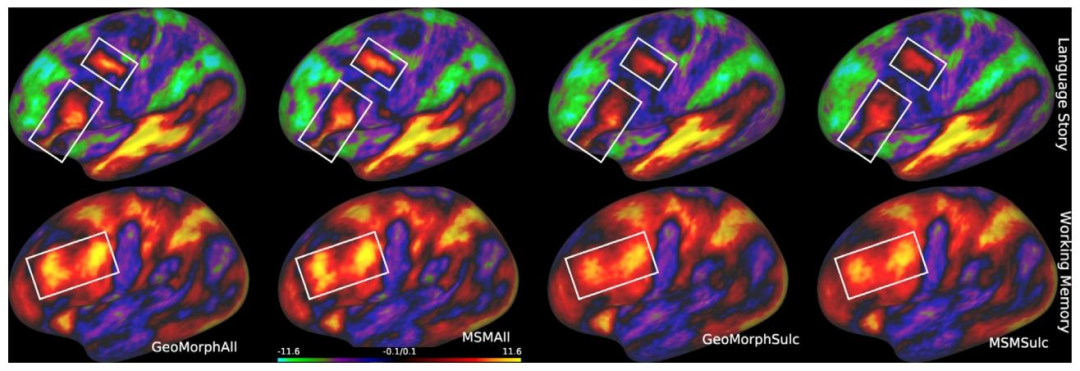 图9 所有方法在(a)语言故事任务、(b)工作记忆任务中的组水平Z统计量空间图对比。白色框突出显示对比度锐度的提升效果,其中GeoMorphAll与MSMAll表现接近且优于单模态方法。