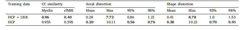 Table 2Multimodal registration results: CC, distortions measures, and average runtime for different methods. HCP (top) and UKB (bottom).