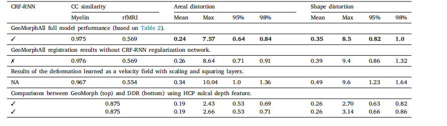In this paper, we presented GeoMorph, an innovative geometricdeep-learning framework specifically designed for multimodal corticalsurface registration. GeoMorph aims to learn a smooth displacementfield that effectively aligns the features on the moving surface withthose on the target surface. By leveraging independent feature extraction and deep-discrete registration, GeoMorph captures crucial characteristics of cortical surfaces and optimizes feature overlap to achieveimproved alignment. To ensure the generation of visually coherent andanatomically plausible deformations, we incorporate a regularizationnetwork based on a deep conditional random field. Experimental resultsusing sulcal depth features demonstrate that GeoMorph outperformsexisting deep-learning methods by achieving enhanced alignment andgenerating smoother deformations. Moreover, GeoMorph exhibits competitive performance on multimodal alignment, when compared toclassical frameworks, while demonstrating vastly reduced run times.This computational efficiency should prove beneficial for large opendata sets or clinical applications, especially when a pre-existing cortical areal template does not exist; this is particularly important inthe context that multimodal templates capture crucial attribute-relatedtrends, which sets GeoMorph apart from conventional methods thatonly generate templates that capture dominant folding patterns (Dalcaet al., 2019).When comparing the performance of GeoMorph against the deeplearning based method S3Reg (as shown in Table 1), it becomes evidentthat S3Reg exhibits significant high peak distortions. This issue islikely attributed to the hexagonal filter utilized in S3Reg, which lacksrobustness to rotational transformations due to the absence of a globalspherical coordinate system. The solution proposed by S3Reg, whichinvolves a combination of three networks, does not seem to fully overcome this problem, despite efforts to enforce diffeomorphisms throughusing the scaling and squaring approach from the diffeomorphic Voxelmorph algorithm (Dalca et al., 2019). Contrastingly, the GeoMorphstructure does not explicitly enforce diffeomorphisms. Nevertheless,all yielded results are discovered to be diffeomorphic---a foreseeableoutcome due to the strong regularization imposed by the GRF-RNNnetwork.A future expansion of GeoMorph aims to explore relaxing thisrequirement within the framework. The motivation for delving intothis aspect arises from recognizing that achieving perfect alignmenton functional topographies proves unattainable with diffeomorphicallyconstrained deformations. This observation is evident in 10% of subjects for area 55b in Glasser et al. (2016a), as underscored in Schneideret al. (2019). Conventional diffeomorphic registration approaches, asshowcased in Thual et al. (2022), tend to exhibit reduced performance in such scenarios. Finally, it should be highlighted that whileMoNet has empirically demonstrated robustness to rotational transformations (Monti et al., 2017; Fawaz et al., 2021), it lacks formalequivariance guarantees. Future versions of GeoMorph will investigate the integration of theoretically grounded rotationally equivariantconvolution frameworks, such as SE(3)-equivariant networks (Fuchset al., 2020). However, thorough evaluation and additional development will be required, as these networks typically impose a significantcomputational complexity burden.Section 4.2 presents compelling evidence of the advantages offeredby GeoMorphAll in achieving enhanced registration outcomes. Theinclusion of myelin and rfMRI features in the registration process hasproven to be beneficial for individual-to-template alignment. A comparison between GeoMorphAll and MSMAll results, as demonstrated inFigs. 7 and 8 using both HCP and UKB datasets, reveals that GeoMorphAll produces a sharper and clearer average map in the UKB datasetwhen compared to MSMAll. This difference may arise from the factthat MSMAll was originally optimized for the HCP dataset and thatthe feature extraction network in GeoMorph is more advantageous inthe context of the UKB dataset, where the data is considerably noisiercompared to the HCP dataset.The computational complexity of GeoMorph is heavily dependenton the resolution of the control points. As a result, we have been limitedto a control grid on an icosphere of level 4 due to memory constraints.Hence, future extensions of this work will explore more efficient methods to overcome this limitation. Additionally, while the CRF has provento be beneficial in regularizing the deformation field, there is a keeninterest in investigating other regularization techniques that fully leverage the characteristics of the problem. One promising approach is thedevelopment of a mechanically learnable regularization penalty thatconsiders the physical properties of brain tissues. This approach aimsto obtain improved and robust deformations while also allowing fortopology-breaking transformations. Furthermore, it is worth noting thatGeoMorph's implementation is entirely based on MoNet convolutionsthat somewhat limit the expressivity of the features derived fromthe network (Fawaz et al., 2021). Improved performance might beachievable through use of fully expressive, rotation-equivariant surfaceconvolutions such as Cohen et al. (2018) and Wiersma et al. (2020).Alternatively, the incorporation of surface transformer networks, leveraging the attention mechanism as proposed by Dahan et al. (2022),could also lead to improvements by enabling more precise featurealignment through enhanced context awareness and better handling ofcomplex surface variations.