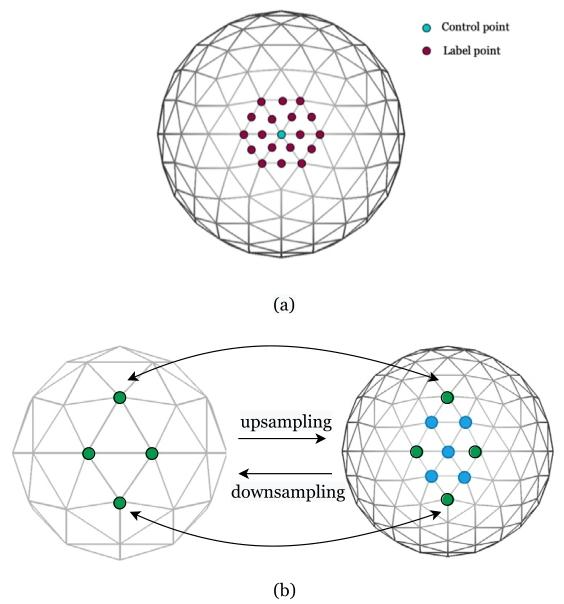 Fig. 1. (a) Example of a control point with its labels on the surface. (b) Upand downsampling on icospheres.