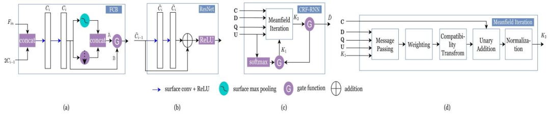 Fig. 3. (a) FCB architecture. (b) ResNet architecture. (c) CRF-RNN architecture. (d) Meafield Iterations architecture