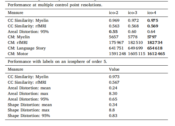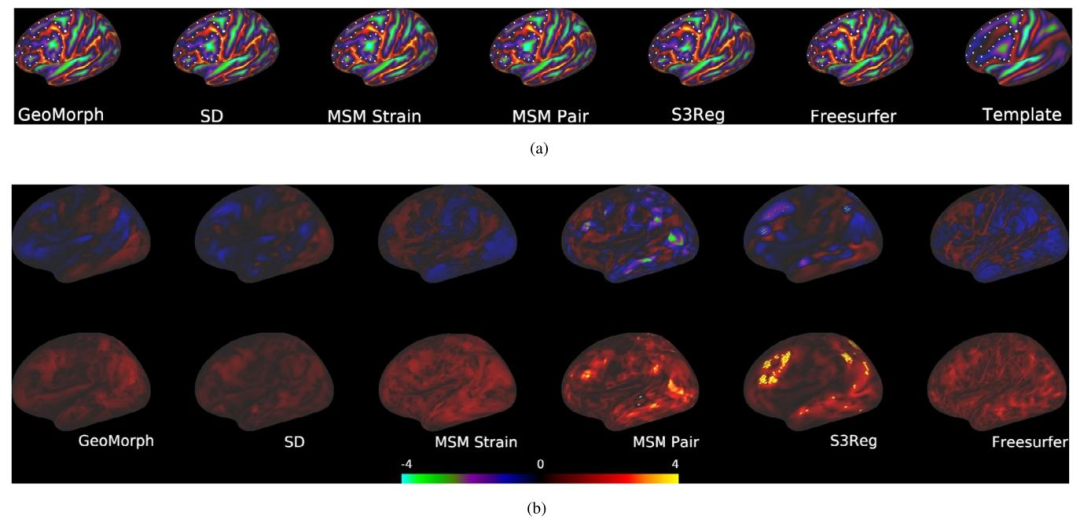 Fig. 6. (a) Registration Performance. (b) Areal (top) and shape (bottom) distortions.