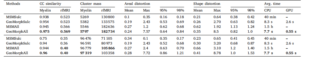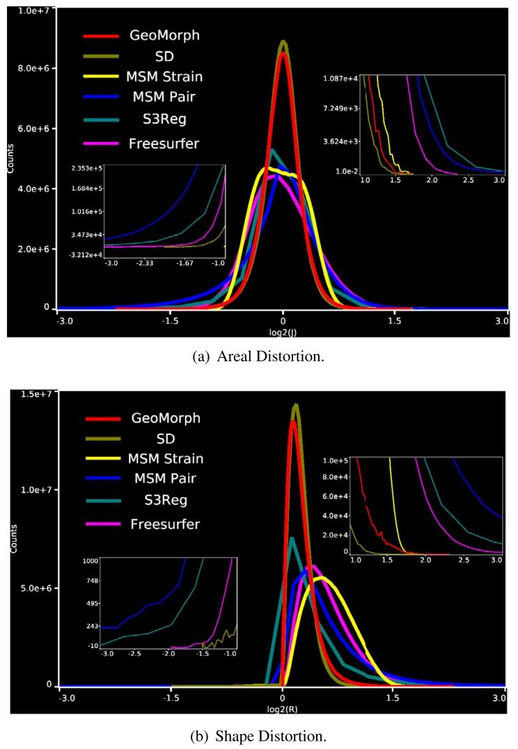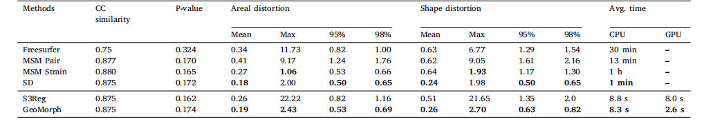 Fig. 4 illustrates the similarity performances of various runs of allmethods plotted against the 95th percentile of the absolute value ofthe areal distortion. For each similarity level, GeoMorph exhibits distortions falling within the range of the best classical methods (SD andMSM Strain) and demonstrates reduced extremes of areal distortionscompared to S3Reg. Table 1 summarizes the performance of all surfaceregistration frameworks on the task of sulcal depth alignment. In eachcase, results are reported for the configuration that generated a meanCC value of approximately 0.88 (as this is the best CC value thatall methods can achieve). Since the P-values of all methods are veryclose and they are all above the threshold for statistical significance(i.e., 0.05), performance should, therefore, be judged in terms of whichmethods achieve the lowest mean, maximum, 95th percentile, and 98thpercentile values of the distortion. In this, GeoMorph is the second bestperforming framework (behind SD but better than MSM Strain). On theother hand, S3Reg and MSM Pair exhibit much poorer performance. Itis worth noting that these values represent the optimal performance ofS3Reg, across all runs. Moreover, it is worth mentioning that, with theexception of S3Reg, all methods do not have a non-positive Jacobiandeterminant, indicating that they do not produce self-intersecting vertices (i.e., diffeomorphic deformation). In terms of average run time,when utilizing a PC equipped with an NVIDIA Titan RTX 24 GB GPUand an Intel Core i9-9820X 3.30 GHz CPU, GeoMorph exhibits the leastGPU and CPU times among all methods.In Fig. 5, we present histograms showcasing the distribution of bothareal and shape distortions, across all test subjects, at CC of 0.88. Byanalyzing Fig. 5a, we observe that SD and GeoMorph predominantly exhibit areal distortions centered around zero. On the contrary, MSM Pair,S3Reg, and (to a lesser degree) Freesurfer demonstrate pronouncedextreme distortions across subjects, as evidenced by the presence oflong tails in the histogram. This trend is also observable in Fig. 5b,where we observe that the distribution of shape distortions, for SD andGeoMorph, predominantly falls below one. Conversely, other methodsexhibit significant instances of extreme distortions.In Fig. 6, we visually evaluate alignment quality, for all benchmarked methods, on one subject from the HCP dataset that exhibitsatypical cortical folding patterns. Additionally, we examine the arealand shape distortions resulting from these methods. The figure illustrates that GeoMorph, SD, and MSM Strain achieve favorable alignment, with minimal distortions. In contrast, the alignments producedby MSM Pair and S3Reg are characterized by regions with very highdistortions.