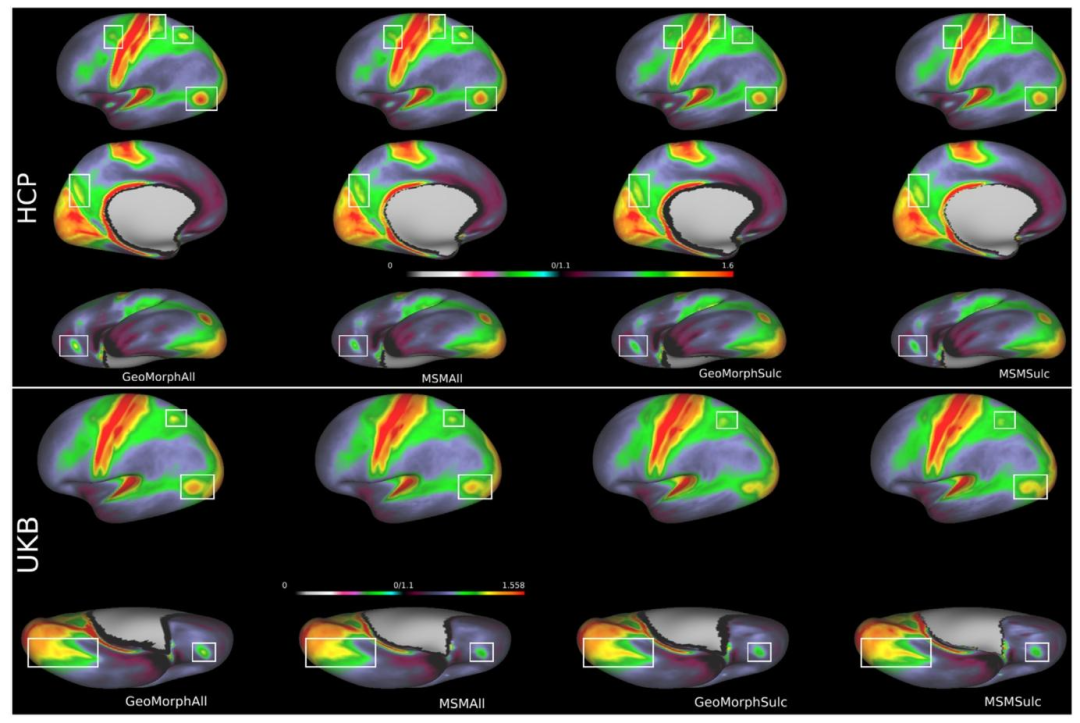 Fig. 7. Intersubject averages of myelin features in HCP (top) and UKB (bottom). Regions in the brain that exhibit significant disparities in contrasts and enhancedperformance between these methods are denoted by the areas highlighted within white boxes.