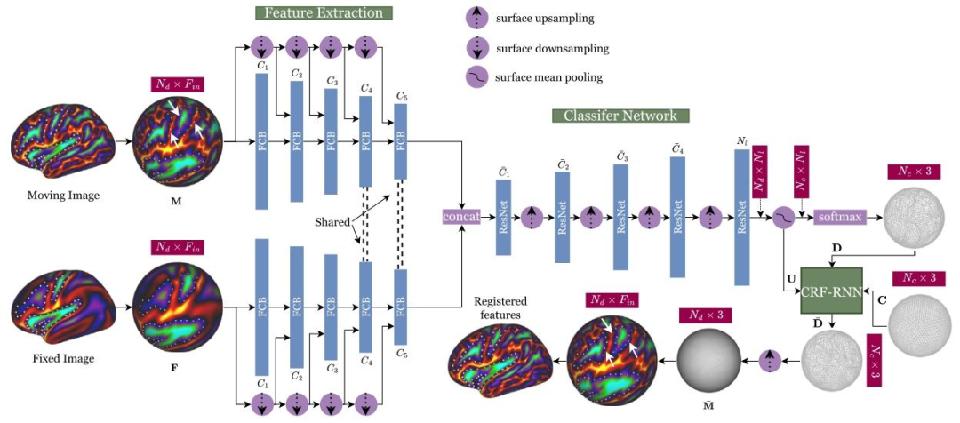 人类大脑皮质是高度回旋折叠的结构,个体间的拓扑结构存在复杂差异(Amunts 等人,2000;Glasser 等人,2016a)。这些差异为皮质表面配准以进行比较分析带来了巨大挑战。 皮质表面配准旨在通过将数据映射到全局平均空间来克服这些挑战,使不同个体大脑组织的共同特征实现重叠。这种配准为各类神经影像分析提供了便利,包括皮质形态测量、功能连接、神经发育及神经外科规划等研究(仅列举部分,Goubran 等人,2019;Risholm 等人,2011;Coalson 等人,2018)。通常,图像匹配以皮质折叠的单变量汇总指标对齐为目标,例如脑沟深度或平均表面曲率(Fischl,2012;Yeo 等人,2009;Robinson 等人,2014);然而,近年来研究发现,皮质折叠难以精确定位某些皮质区域,因此部分框架转而以皮质区域对齐为目标(Nenning 等人,2017;Robinson 等人,2014、2018;Abdollahi 等人,2014)。由于皮质"最优"对齐的定义尚不明确,研究者已开发出多种表面配准算法和技术,涵盖经典优化方法与基于学习的方法(Heinrich 和 Hansen,2020;Dalca 等人,2019),每种方法均采用不同的数学模型、优化算法和相似性度量。 传统上,皮质表面会被映射到球体上,因为球体更能捕捉皮质上点之间的测地线距离。配准过程通过优化目标球体与变形后源球体上特征的相似性度量,并施加平滑性约束来实现。Freesurfer(Fischl 等人,1999)通过优化一组受试者的平均凸度度量与个体凸度度量之间的均方误差(MSE)来配准表面折叠模式,该误差由受试者间凸度的逆方差调制。球形 demons 算法(SD,Yeo 等人,2009)采用由粗到细的方式配准两幅球形图像,它修改了最初在欧几里得图像空间中实现的经典微分同胚 demons 方法(Vercauteren 等人,2009),使用与球面相切的速度向量。多模态表面匹配(MSM,Robinson 等人,2014、2018)同样采用由粗到细的匹配方式,但选择离散优化而非经典方法,因为这在代价函数选择上更具灵活性,且对噪声和局部极小值更稳健。在 MSM 中,通过对变形施加受生物力学启发的超弹性应变正则化,来保证微分同胚特性。研究发现,相较于 Freesurfer、SD 及基于体积的方法,这些特征的组合显著改善了噪声区域特征(静息态功能磁共振成像和 T1w/T2w 髓鞘成像)的对齐效果(Coalson 等人,2018;Glasser 等人,2016b;Robinson 等人,2014、2018;Smith 等人,2013)。 遗憾的是,由于离散优化涉及解决复杂的组合标记问题,其代价是运行时间相对较长(第 4 节)。此外,尽管微分同胚长期以来被视为皮质表面配准的先决条件,但有证据表明,皮质拓扑结构的变异方式可能违背这一假设(Glasser 等人,2016a;Van Essen 和 Glasser,2018)。解决这类问题并非易事,因为要学习如何对齐噪声特征图,同时以合理的方式打破微分同胚约束,首先需要更好地理解变异的潜在来源。因此,一个潜在的解决方案是利用基于学习的图像配准框架(Balakrishnan 等人,2019;Dalca 等人,2019;De Vos 等人,2019;Fan 等人,2018;Heinrich,2019;Pielawski 等人,2020;Shao 等人,2021;Suliman 等人,2022),这些框架已被证明与经典方法精度相当,但效率大幅提升。通过这些框架,对足够多的个体大脑进行配对对齐在计算上成为可能,从而能够映射潜在的变异模式(Guo 等人,2025),或生成基于人口统计学变量或目标表型的群体平均模板(Dalca 等人,2019)。 迄今为止,大多数基于学习的方法集中于体积配准,以现有的经过充分测试且可泛化的卷积架构(如 U-Net,Ronneberger 等人,2015)为基础,学习密集位移场。相比之下,非欧几里得网格域的学习方法尚不成熟,因为其缺乏全局坐标系,导致卷积运算计算效率较低且实现难度更大(Bronstein 等人,2017;Fawaz 等人,2021)。因此,一系列不同的框架应运而生,这些框架通常针对截然不同的非欧几里得域(包括点云(Qi 等人,2017)、流形(Monti 等人,2017)、球体(Zhao 等人,2019)和图(Defferrard 等人,2016))的需求进行定制。尽管如此,仍存在一些值得关注的基于学习的皮质表面配准框架,包括 S3Reg(Zhao 等人,2021)------其通过在球形 U-Net 架构(Zhao 等人,2019)中实现直接邻域(DiNe)卷积来学习位移,并利用微分同胚 Voxelmorph 算法(Dalca 等人,2019)的缩放和平方法来保证微分同胚特性;SUGAR(Ren 等人,2024)------其使用图注意力网络(Velickovic 等人,2017)学习可跨数据集泛化的稳健表面变换;以及 DDR(Suliman 等人,2022)------本文所提框架的早期版本,其在 U-Net 架构中采用 MoNet 卷积(Monti 等人,2017),并通过深度离散配准(Heinrich,2019)进行优化。研究表明,SUGAR 和 DDR 均能学习到比 S3Reg 更平滑、更精确的映射,这很可能是因为与 MoNet(Monti 等人,2017)或图卷积(Velickovic 等人,2017)相比,DiNe 卷积的旋转等变性相对较弱(Zhao 等人,2021;Ren 等人,2024;Suliman 等人,2022)。 所有先前的方法均以皮质折叠的单变量汇总指标(脑沟图和/或曲率)为配准驱动。本文则提出 GeoMorph:一种基于学习的框架,用于多模态皮质区域特征的稳健对齐。由于功能磁共振成像和 T1w/T2w 髓鞘图的噪声水平更高且更稀疏,这一任务难度更大。GeoMorph 再次从 MSM 和 DDR 中汲取灵感,将图像配准构建为深度离散多标签分类问题------在该问题中,低分辨率控制点网格上的点被约束变形到一组固定的目标位置之一,以最大化源(或移动)网格与固定参考网格之间的重叠。然而,它超越了 DDR 中提出的 U-Net 框架,用特征提取网络替代编码器------该特征提取网络为移动特征图和参考特征图分别学习独立的低维表示,以提取特定于每个表面的显著皮质特征。这在处理多通道多模态区域特征时