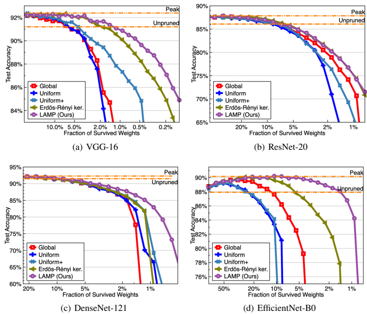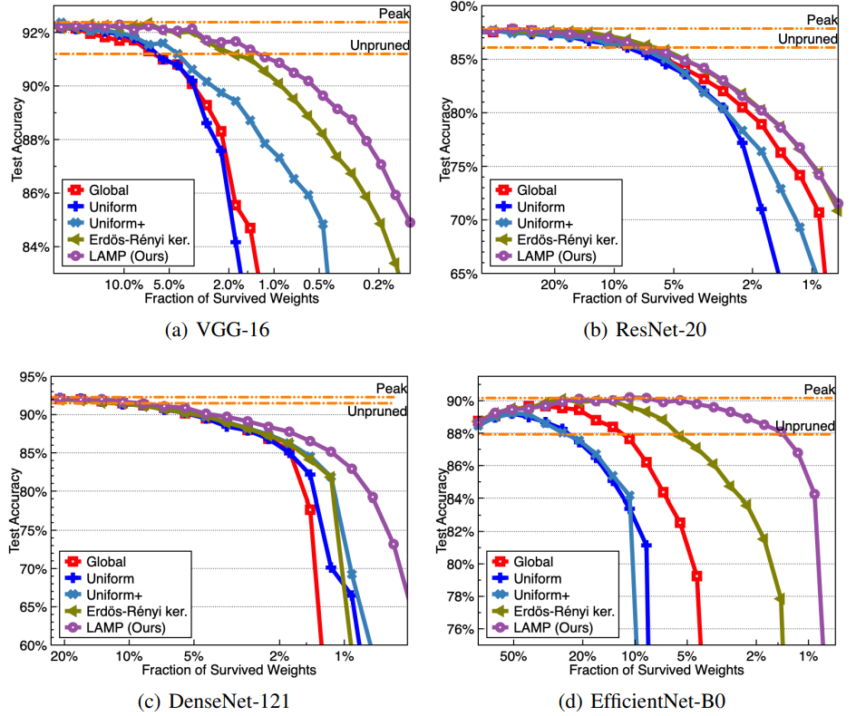 - LAMP在相同稀疏度下准确率更高,尤其在高效网络(如EfficientNet-B0)中优势显著;