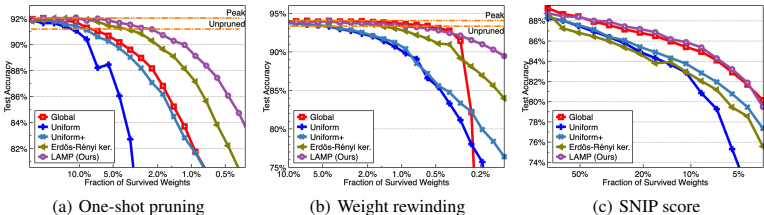 - 计算LAMP评分:对每层权重按幅度排序,计算每个连接的LAMP评分。
