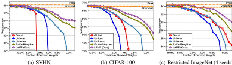 LAMP进一步考虑剪枝对整个模型输出的失真影响,通过贪心策略逐步移除对模型输出失真最小的连接。