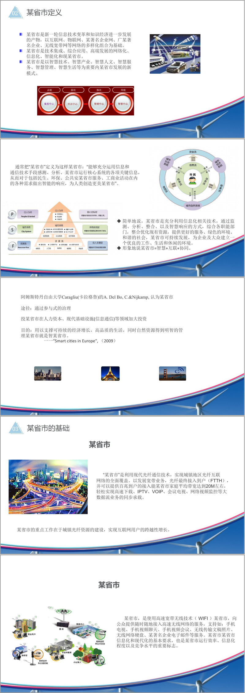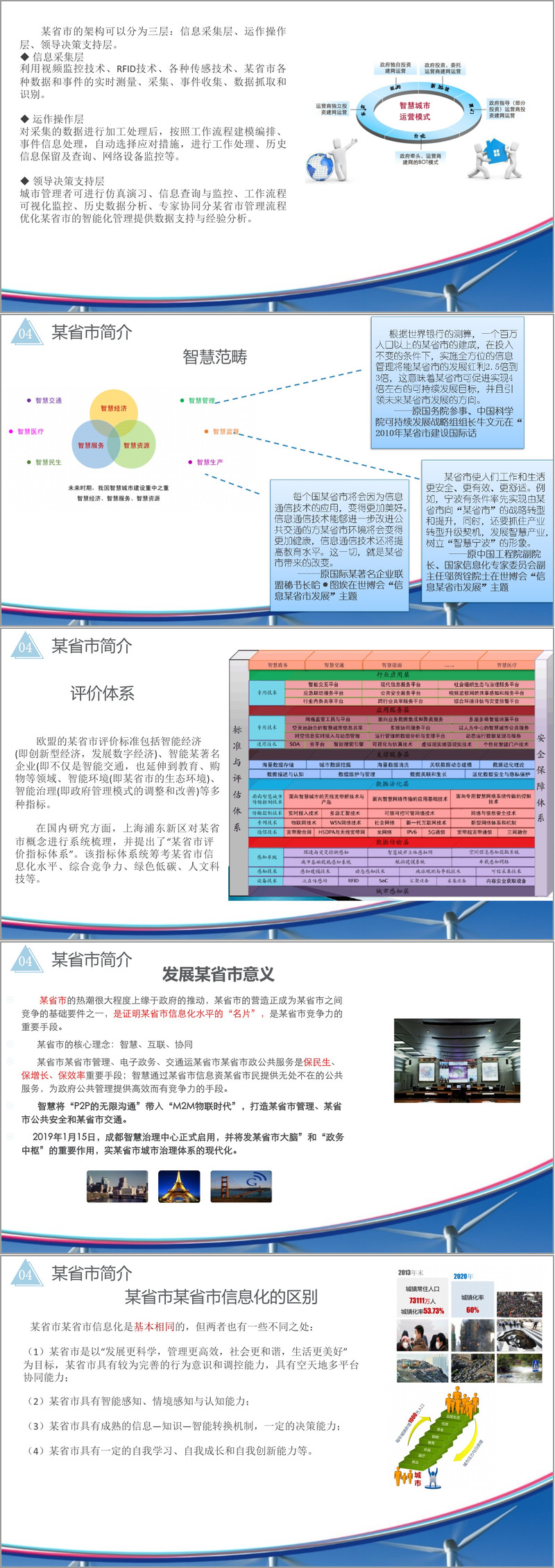 某省市的定义基于信息技术集成与知识经济发展,其核心在于借助互联网、物联网、无线宽带等多网络融合,实现智慧技术、产业、人文、服务与管理的协同。学者Caragliu等强调,智慧城市需通过参与式治理和投资于人力资本与现代基础设施,以实现可持续经济增长、高品质生活和自然资源智能化管理。其建设基本原则包括统筹资源整合、立足民生、政府引导与市场结合,并确保可管可控和安全。