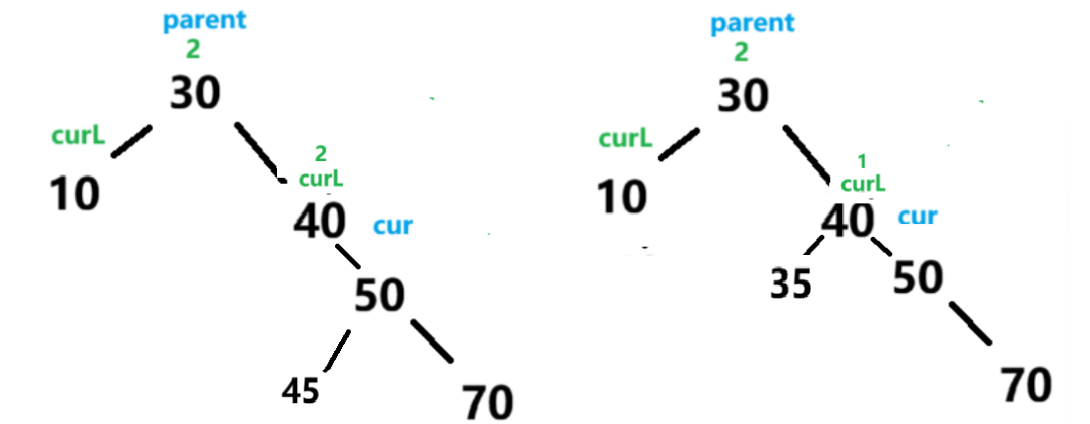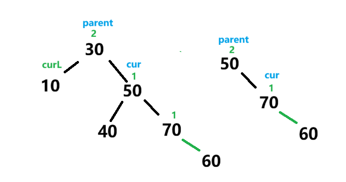 此时失衡节点是parent bf==2 说明右子树偏高 ,此时就是需要cur成为树顶 ,然后将parent变成其左子树 并将原本的左子树变成parent的右子树