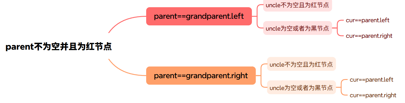 首先先确定这是一个循环,不难发现当parent为黑色的时候 ,不需要额外更改颜色,所以循环条件就是parent存在且为红节点。