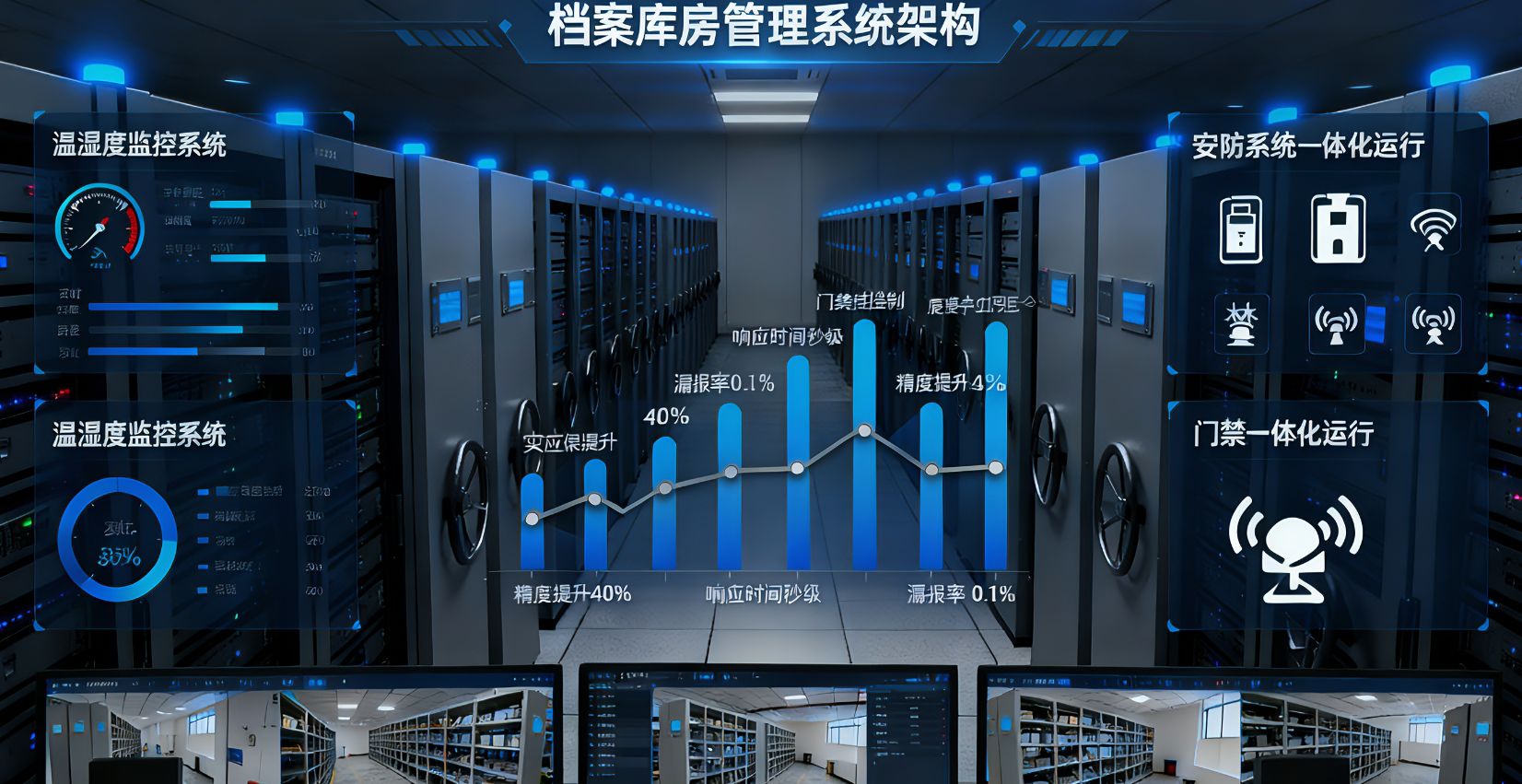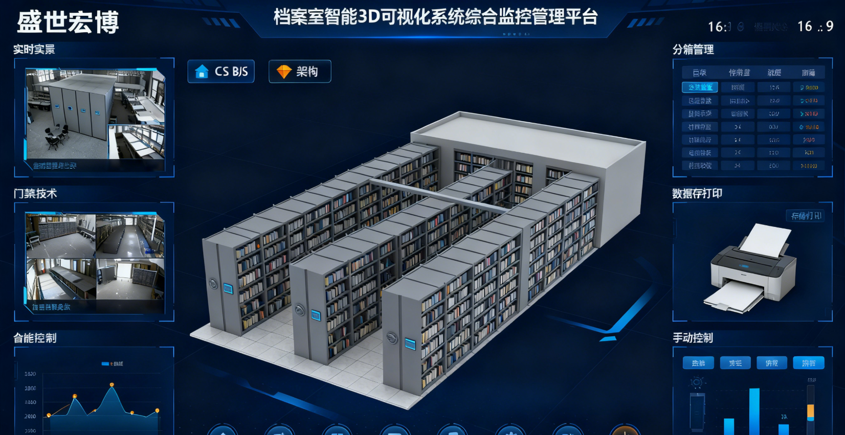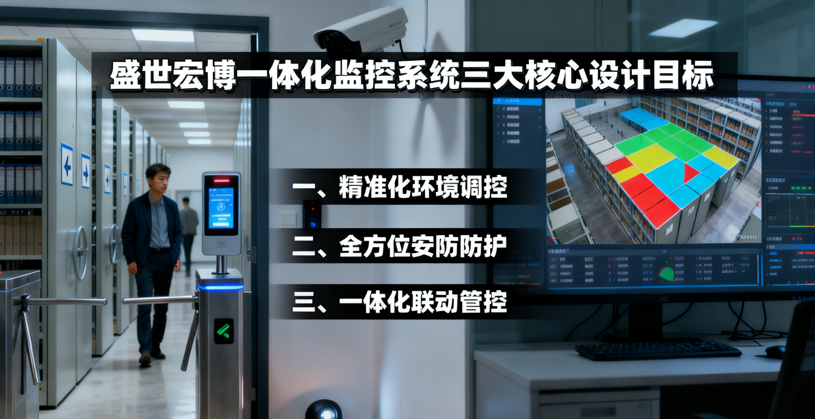 档案库房的管理核心需求集中于"环境可控"与"安全无虞"两大维度。基于此,盛世宏博一体化监控系统确立了三大核心设计目标:其一,精准化环境调控 ,依据《档案馆建筑设计规范》《档案法》等国家标准,将温湿度严格控制在"温度14 - 24℃、相对湿度45% - 60%"的最优区间,同时实现环境参数的实时采集与动态调节;其二,全方位安防防护 ,整合入侵检测、视频监控、门禁管理等多重安防手段,构建"事前预警、事中处置、事后追溯"的全流程防护体系;其三,一体化联动管控,打破环境监控与安防系统的信息壁垒,实现数据互通、事件联动,提升库房管理的智能化与自动化水平。三大目标共同构成了系统架构设计的底层逻辑,确保架构落地后能直接服务于档案保存的核心需求。