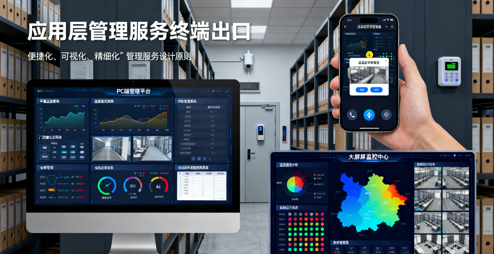 移动端APP聚焦于"移动化管控",为管理人员提供关键信息推送与应急处置功能。当库房出现温湿度异常或安防报警时,APP立即推送预警信息,管理人员可通过APP查看实时数据、视频画面,甚至远程下发设备控制指令,实现应急事件的快速处置。大屏监控中心则采用可视化展示技术,将库房温湿度分布、设备运行状态、安防监控画面等核心信息集中展示,为管理人员提供直观的全局管控视角,适用于多库房集中管理的场景。