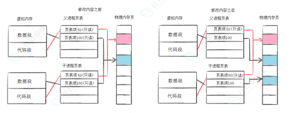 通常,⽗⼦代码共享,⽗⼦再不写⼊时,数据也是共享的,当任意⼀⽅试图写⼊,便以写时拷⻉的⽅式各⾃⼀份副本。具体⻅下图: