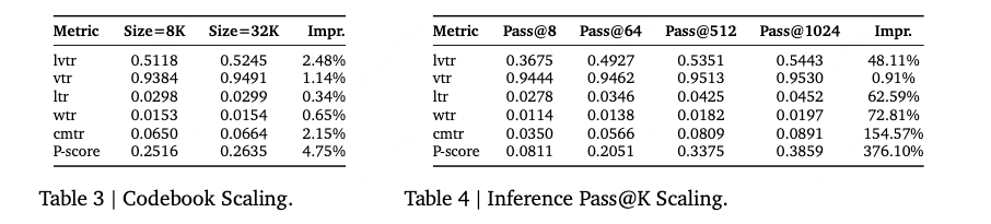 为探究码本规模对模型性能的影响,我们将码本大小从8,192扩展至32,768进行实验。需特别注意:如参数扩展实验所定义,NTP损失在此不可直接比较------因为码本扩增本质上扩大了交叉熵损失的候选集,直接比较损失值会产生误导。因此我们采用基于奖励的指标进行评估,各指标性能提升如表3所示。结果表明:扩大码本规模可显著提升播放时长类指标,并在交互类指标上获得小幅改善。