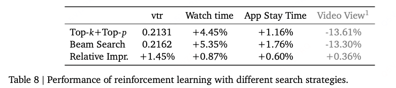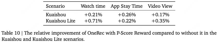 本节观察了使用P-Score作为奖励时,强化学习带来的综合性提升。基于上述消融实验结论,我们选择最优RL配置:采用束搜索生成RL样本,并使用当前策略模型作为参考模型。我们在快手和快手极速版两个场景中验证RL效果,结果汇总于表1。从数据可得结论:在两个场景中,P-Score均在提升应用停留时长和观看时长的同时,增加了视频观看量,这表明整体用户推荐体验获得了显著提升。(与前文介绍reward会造成id无法映射回item,不矛盾吗?)