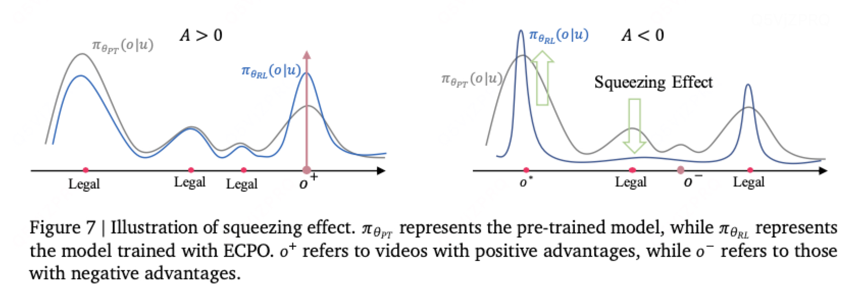 引入基于ECPO的强化学习会显著增加非法输出的生成。最新研究(Ren and Sutherland, 2024)表明,这是由于负优势函数引发的压缩效应所致。如图7所示:预训练模型已学会生成绝大多数合法标记,加入强化学习后,𝐴 > 0的项目仅会轻微调整概率分布;而当施加𝐴 < 0的项目时,模型会将大部分概率质量压缩到当前认为的最优输出𝑜∗上,导致部分合法标记的概率被压缩至与非法标记相当的水平,从而使模型难以区分合法标记。