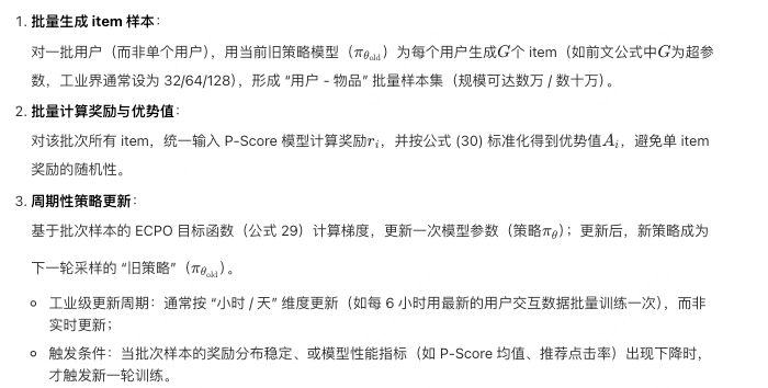 - 技术选型逻辑 :采用在线策略强化学习(on-policy RL) 而非离线 RL,核心原因是:生成式物品空间是动态的(模型生成的物品可能是未曝光过的新物品),on-policy RL 能基于当前模型生成的物品与用户实时交互反馈(奖励)更新策略,确保奖励信号与模型生成行为强关联,避免离线 RL 的 "策略偏差" 问题。