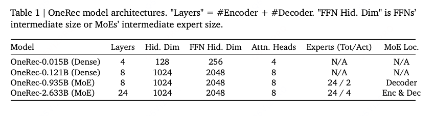 OneRec系列包含四个推荐任务专用模型(两个稠密模型与两个MoE变体),其层数、隐藏维度、注意力头数等关键架构超参数详见表1。这些模型的编码器与解码器层数保持一致: