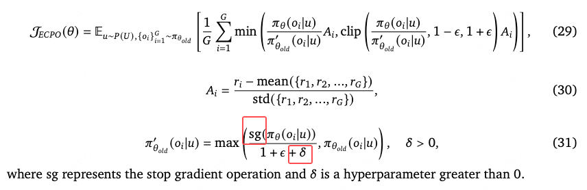 优化目标形式与ECPO保持一致(见公式29),并直接使用𝐴𝑖作为优势函数值。