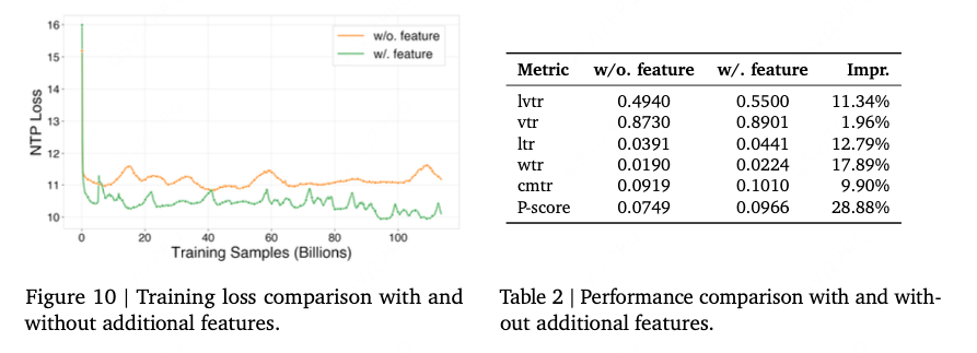 如图10和表2所示,采用增强特征配置的模型实现了更低的训练损失,并在推荐质量的多个维度上取得显著提升。(有哪些特征?)