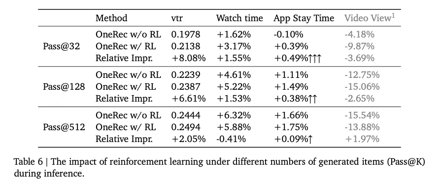 强化学习通过优化采样项的概率分布来提高高奖励项的选中概率,从而显著提升采样效率。为量化该效果,我们在pass@32、pass@128和pass@512三个采样点进行实验(结果汇总于表6)。以未使用RL的模型为基线,将应用停留时长的提升幅度定义为采样效率差距。值得注意的是,RL在pass@32处显示出最大的提升差距,这表明排名靠前项的准确率得到显著增强。这种提升对降低采样开销至关重要,因其能确保在少量采样时仍保持高精度。在需要平衡成本与收益的推荐系统中,较低采样数𝐾下的精度提升为实现这种平衡提供了坚实基础。