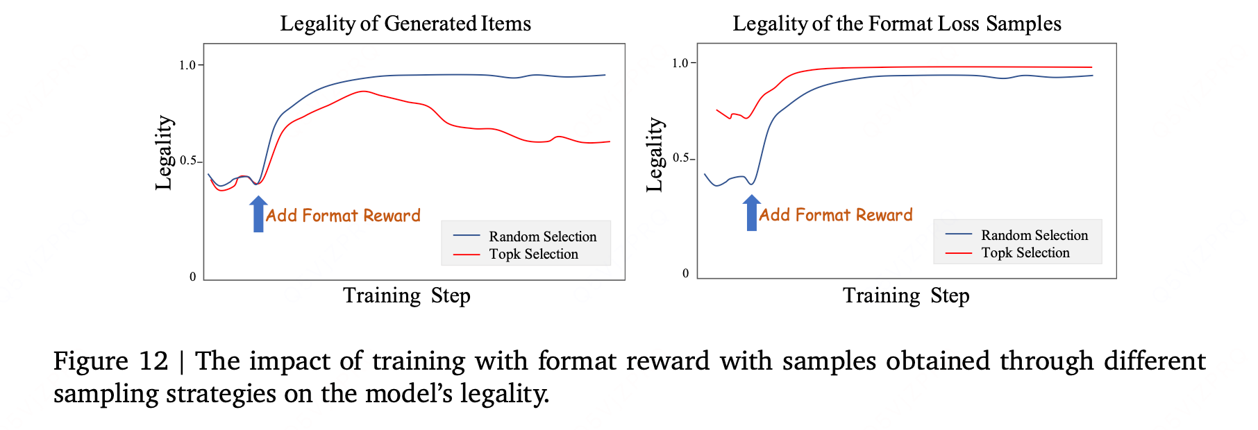 本节通过实验验证格式奖励的有效性。如第2.4.2节所述,在预训练模型中引入强化学习后,由于挤压效应的影响,输出合法率显著下降至50%以下------这意味着超过半数生成的语义ID无法对应实际视频ID,严重损害了推荐稳定性与推理可扩展性。