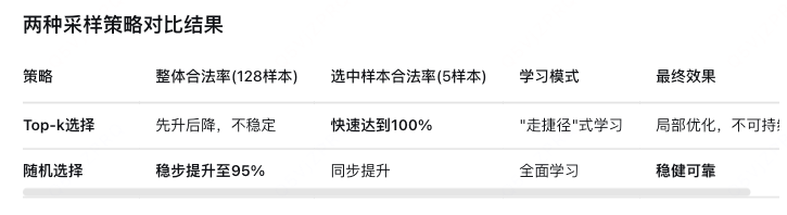 图12展示了两种方法对输出合法率的影响。左图显示所有128个生成样本的合法率变化,右图则聚焦被选中样本的表现。未使用格式奖励时,基线合法率始终低于50%。Top-k选择呈现出有趣模式:虽然整体合法率呈现先升后降趋势,但被选中样本的合法率迅速达到100%,表明模型学会了仅在排名靠前的子集中生成合法输出。相比之下,随机选择虽然设置了更加困难的学习目标,但推动了稳定改进------最终达到95%的合法率且未出现下降趋势。