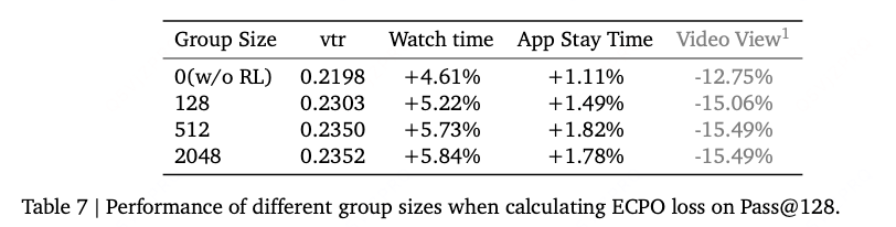 在ECPO训练中,扩大动作探索空间(每次搜索的候选空间还是RL训练过程中的RL组大小)能增加发现具有最大奖励的最优项目的概率,但也会带来更高的计算成本。为研究这种权衡关系,我们分析了探索空间大小(即组大小)对性能的影响(结果汇总于表7)。从表中可观察到,当组大小从128增至512时,性能实现显著提升,这充分证明了扩大探索空间的积极影响。令人稍感遗憾的是,将探索空间进一步扩大至2048并未带来更多收益,这可能是由于当前参考模型的多样性不足以发现更多优质项目。尽管如此,该发现仍具积极意义,我们根据实证经验建议将ECPO训练组大小设置为推理输出数量的四倍左右,以获得最佳效果。