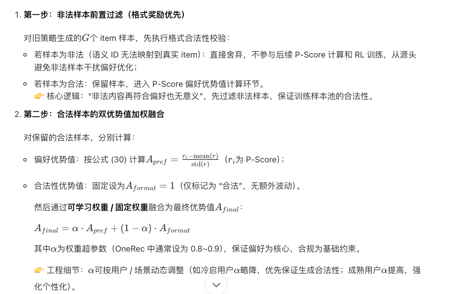- 衔接生成式架构:RL 在 "生成式物品空间" 中训练,与 OneRec 的端到端生成范式完美适配,实现 "预训练拟合基础分布→RL 对齐真实偏好" 的两阶段优化,最终突破传统推荐的性能天花板。