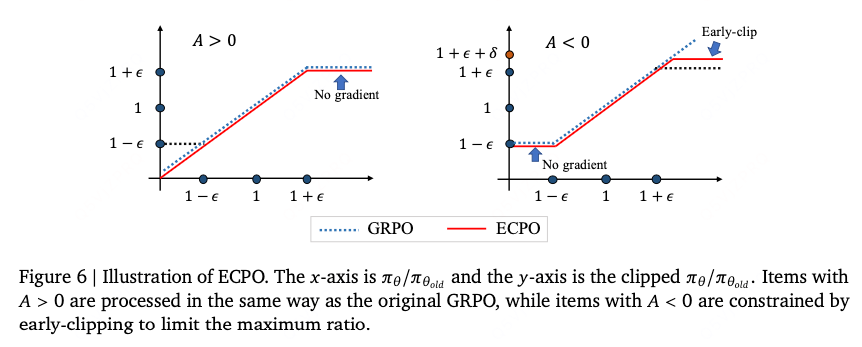 对GRPO(群组策略相对优化)(Liu等人,2024)进行了改进以提升训练稳定性(如图6所示)。原始GRPO允许负优势函数对应较大的策略比率(𝜋𝜃/𝜋𝜃𝑜𝑙𝑑),这易导致梯度爆炸。因此,我们预先对高比率策略进行裁剪:在保证训练稳定性的同时,仍使相应负优势函数发挥作用。𝛿值越大,可容忍的策略比率范围越大,即可承受的梯度变化范围越大。该参数可根据实际需求调整------在OneRec中我们设置𝛿=0.1,这意味着允许负优势函数对应的策略比率略微超过1+𝜖。我们移除了KL散度损失项,因为OneRec中强化学习(RL)与监督微调(SFT)采用联合训练方式,SFT损失足以确保模型稳定性。