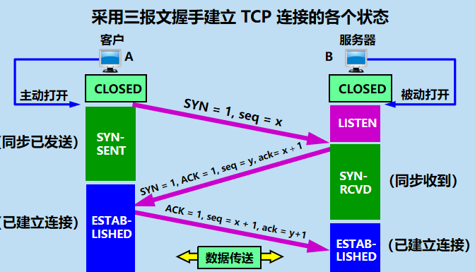 (2)B发送连接接受报文SYN=1,对A的序号为x的报文进行确认,故确认号有效ACK=1,ack_seq=x+1,seq=y,y是B的起始序号;