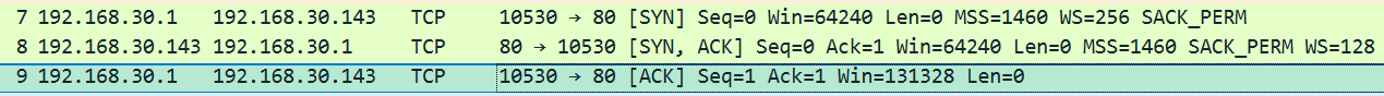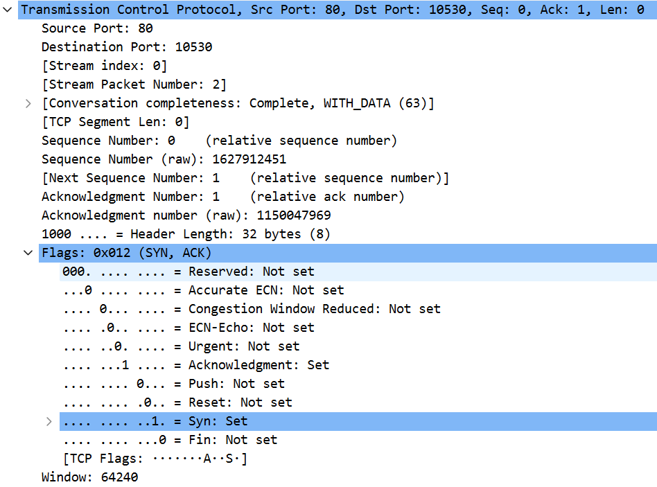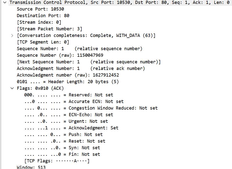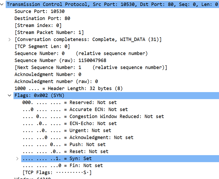 TCP连接请求报文:SYN=1,seq=0(发送方的起始序号为0),ACK控制位=0,此时确认号无效,即没有确认,此时我们很多时候可能看到ack_seq=0,但只要ACK控制位=0,它就无效,任何确认都不可能是0,因为序号最小从0开始,确认号最少从1开始。另外该TCP报文的源端口号为10530,目的端口号80,在确认报文中,源端口号和目的端口号将对调。