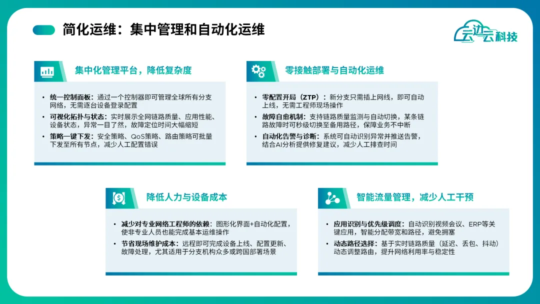 **简捷自动化运维:**提供集中管理控制台,支持分支设备零接触部署,旨在提升运维效率,降低管理成本。