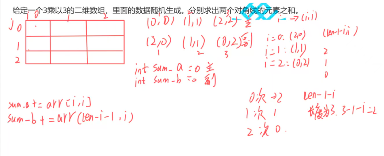 来到今天的最后一题!!给定一个3乘以3的二维数组,里面的数据随机生成。分别求出两个对角线的元素之和