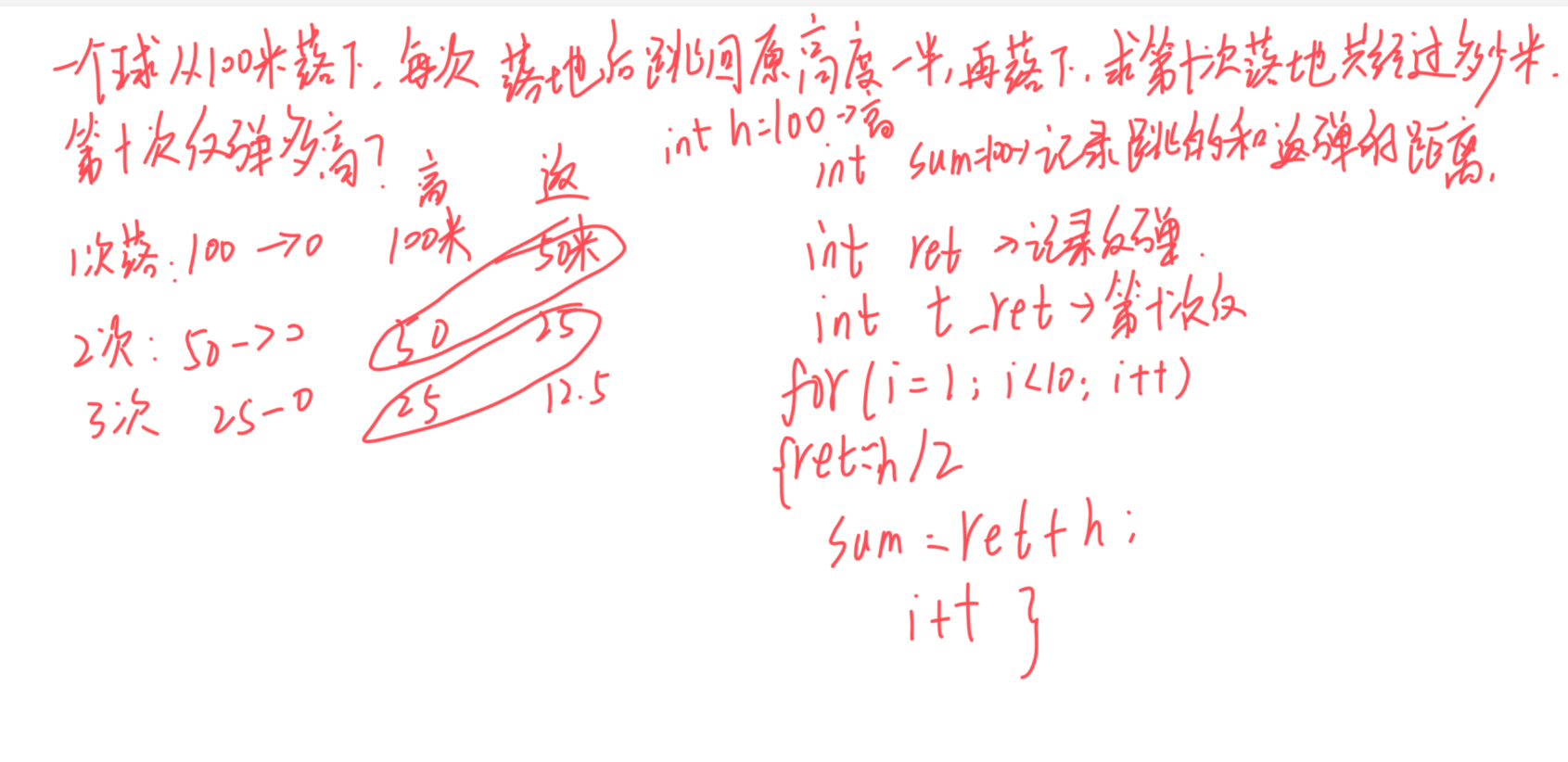 这个是我的理论思路,但是还是会出现有小数的情况,所以我们需要改为double类型!然后就是在我们寻找规律时候会发现总会有两组数据是相同的,然后会出现一个单独的数,而那个数正好是反弹的距离。那我们可以设想,如果算到第九次的所有距离那么一定会出现一个反弹(因为第九次降落我们才能算完九次,然而降落就会弹起来),也就是说我们只需要循环九次,最后一次弹起来的那个数我们记录下来就是第十次反弹的距离。