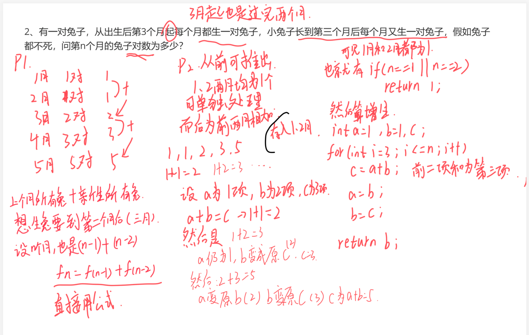我们继续来看第二题:有一对兔子,从出生后第3个月起每个月都生一对兔子,小兔子长到第三个月后每个月又生一对兔子,假如兔都不死,问第n个月的兔子对数为多少?