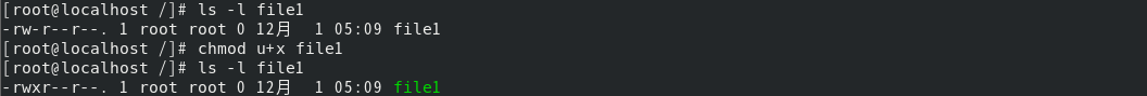 chmod u+x file1 # 为file1文件的拥有用户添加执行权限。其中u代表文件拥有用户,+代表添加,x代表执行的权限