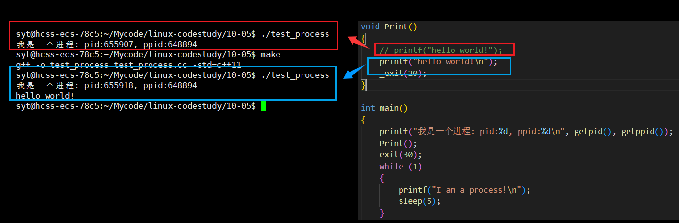 - 在任意地方调用exit,非main函数exit,进程结束。