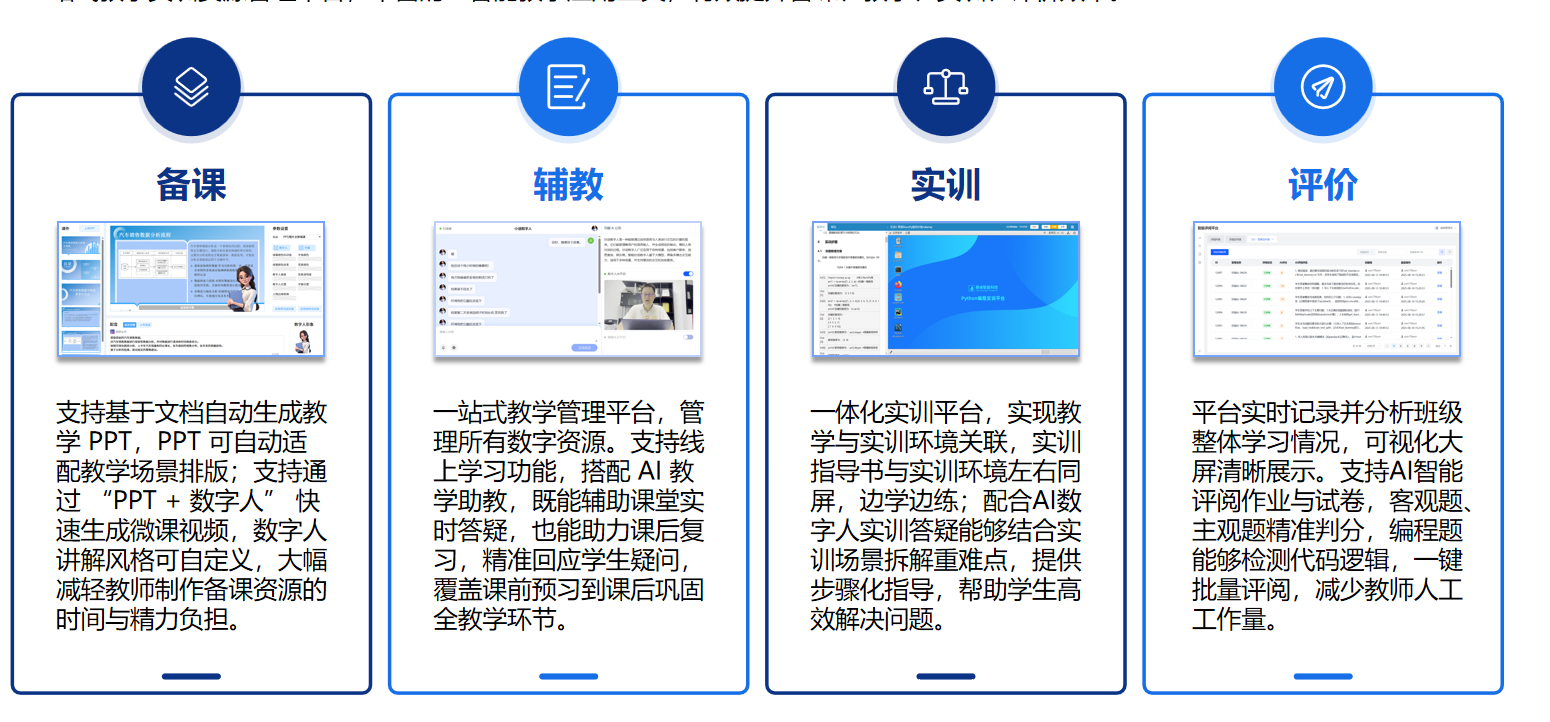 一站式教学实训资源管理平台,丰富的AI智能教学应用工具,有效提升备课、教学、实训、评价效率。