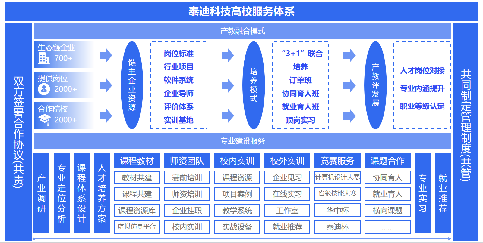 ❸ 产融服务:提供联合制定培养方案、共研教材、师资培训的产教融合服务,对接产业需求,助力人才与岗位无缝衔接。