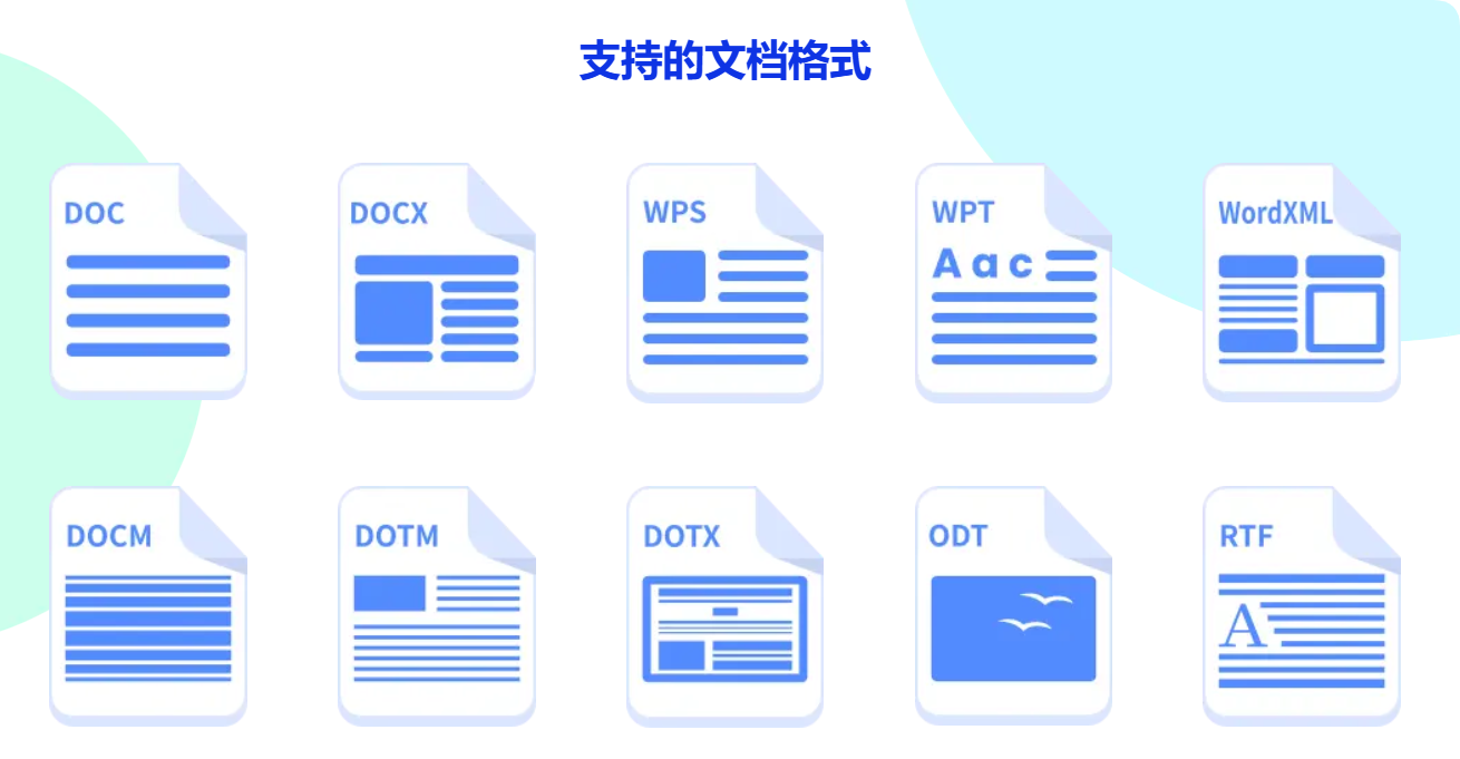 - 支持 DOC、DOCX、WPS、WPT、ODT、RTF、WordXML 等多种文件格式