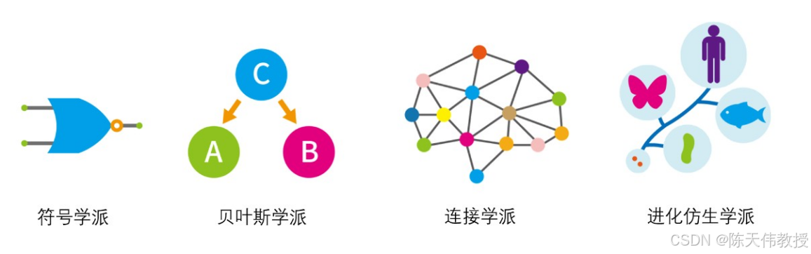 为了解决这一挑战,历史上涌现出了许多理论和方法,最终形成了四个主要学派:符号学派、贝叶斯学派、连接学派和进化仿生学派。