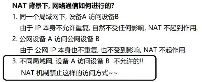 5.如果公网设备 尝试访问局域网设备B 这样是不允许的 公网没局域网设备信息就去访问广域网 就算广域网返回信息 公网又发给谁呢?