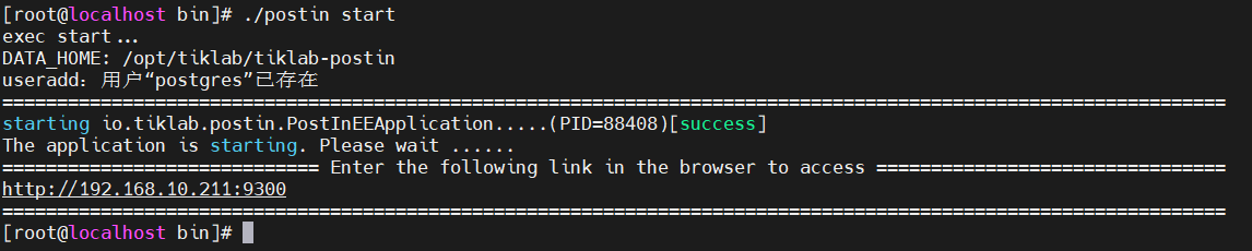 - 启动,系统默认安装路径为/opt目录,进入/opt/tiklab-postin/bin目录下,执行./postin start即可启动成功。