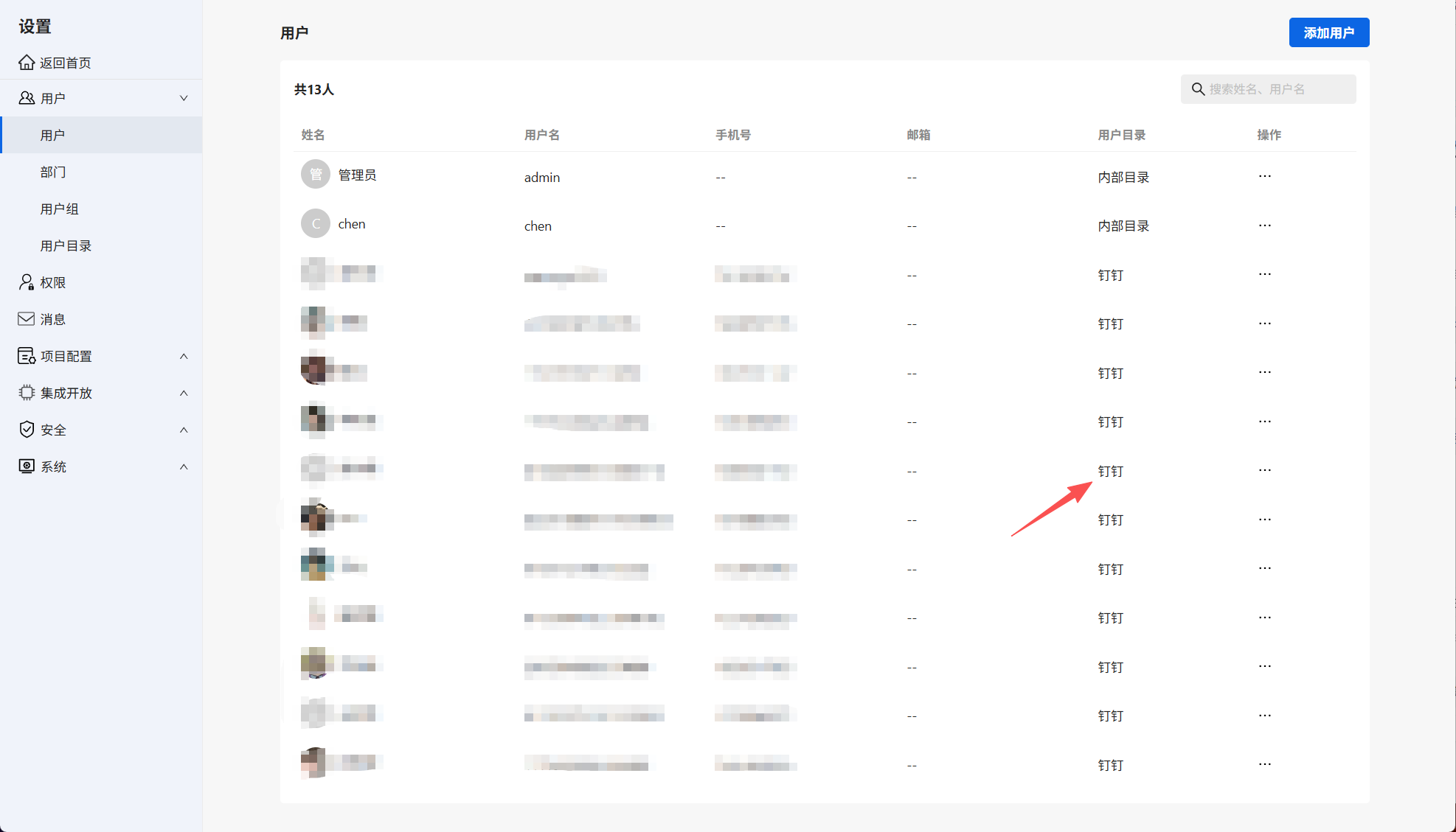 配置完成后在用户列表可以查询到同步的钉钉用户。