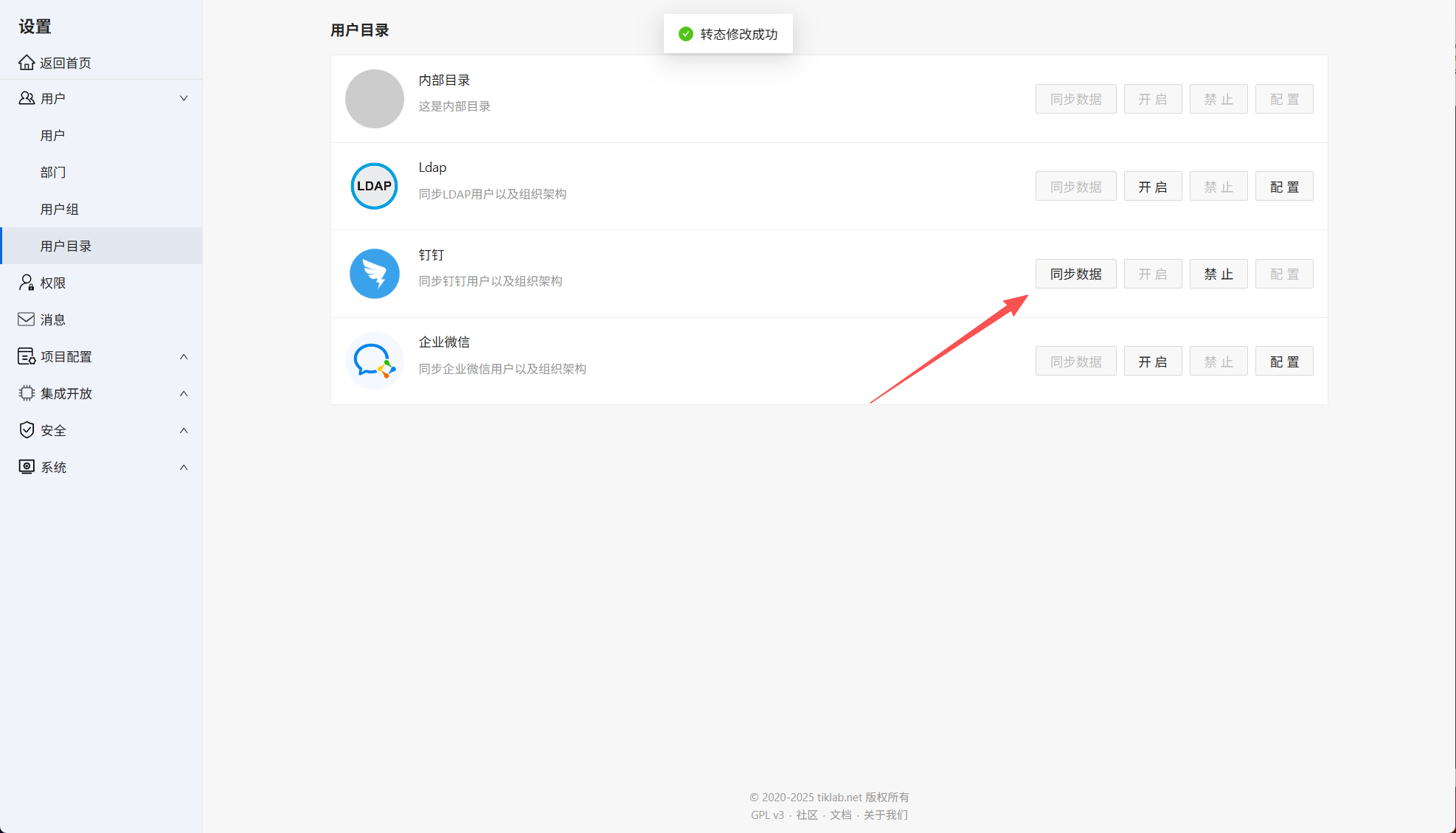 配置成功后点击开启,此时同步数据的按钮会亮起,点击同步数据,就会把钉钉下的用户信息同步到PostIn。