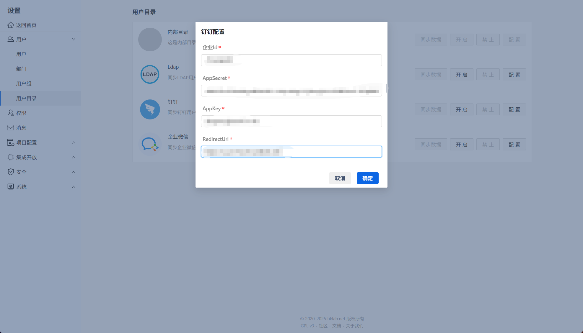 配置钉钉登录,首先需要填写钉钉的信息,开启钉钉配置后即可同步用户信息及登录。